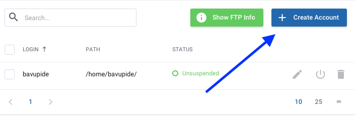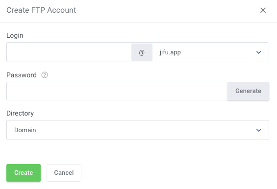 - Fill out the FTP account creation form. Enter the account login, select the domain, input the password, and choose the directory to which the account should have access.