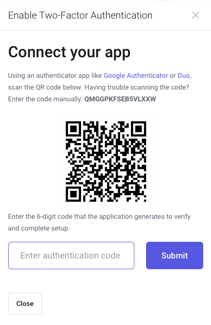 - Download an authentication app, such as Google Authenticator, on your phone, and scan the QR code displayed on the screen or enter the code manually.